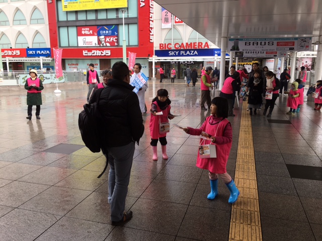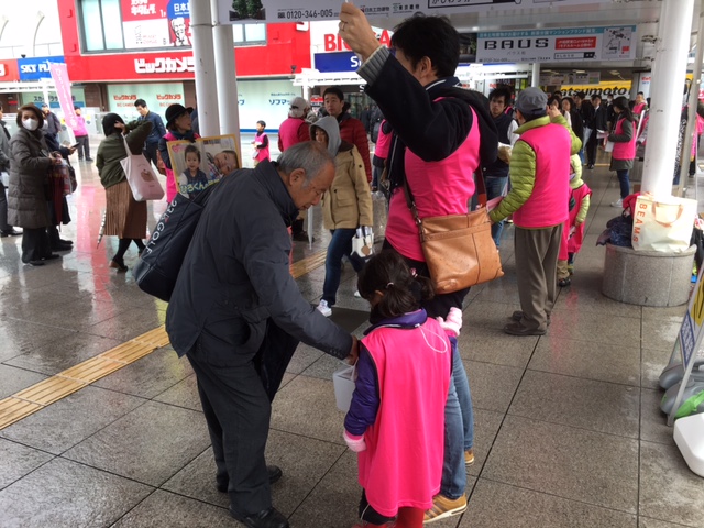 昨日は40名のボランティアの方々が集まってくださいました。小さな可愛いボランティアさんも10名、ピンクのビブスを着て一生懸命頑張ってくれました。大人に負けず劣らずの大きな声で「よろしくお願いします!」とチラシを手渡し、募金をしてくださった方には「ありがとうございます!」とお礼を伝える…その姿に私たちが励まされました。