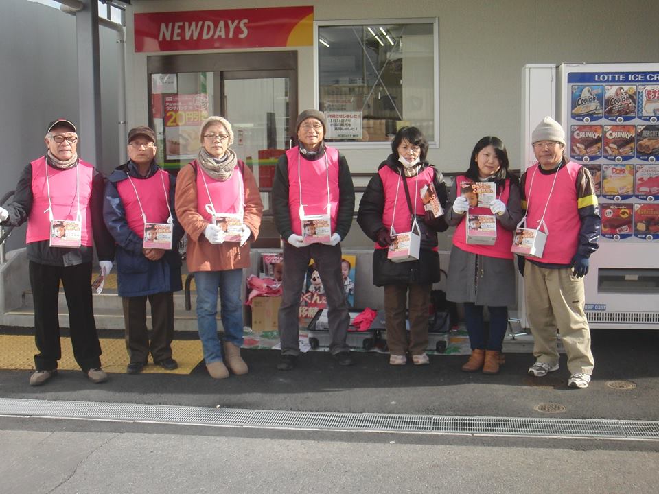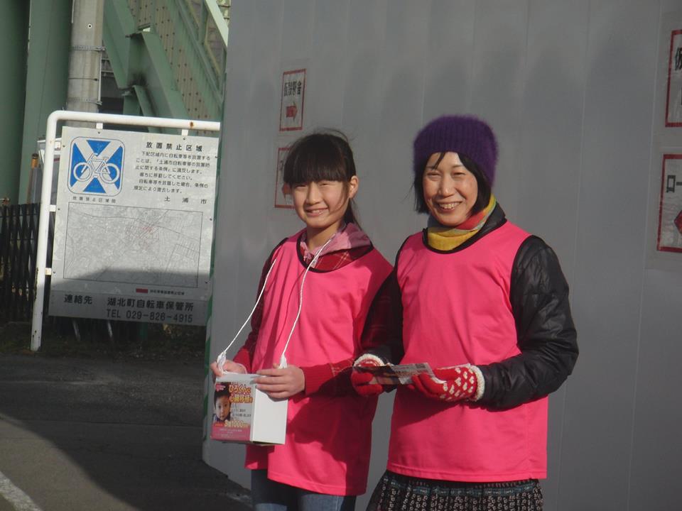 1月14日(土)神立駅前では2回目の街頭募金活動を行いました。ボランティア14人が集まりました。FACE BOOKを見て、わざわざ駆けつけて、募金をしてくれた方がいました。 また貯金箱預金を叩いて小銭のたくさん入った紙袋を渡してくれた方もいました。犬を乗せた女性は信号待ちの車の窓越しに募金を手渡してくれました。年配の男性は私の子も心臓病で苦労しましたが、今は健常者と一緒に働いていますと、募金を入れてくれました。水曜日の夕方は暗くなって夜風が寒かったですが、今日は日本海側で雪が降っていたそうで、太平洋側の茨城でも寒い風が身に応えました。でも、大声をあげての募金活動に熱が入って、風を吹き飛ばしました。 皆様ご支援ありがとうございます。きっと、きっと、この暖かいご支援に支えられ、一日も早い移植手術が成功しますよう、祈ります。