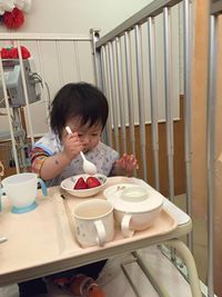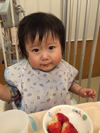 いちごデビューしました! 私の実家のお隣さんからいただいたあま〜いいちご。 最初は潰した汁を一口。 次は少しだけ身も一緒に。 お口に合うかな? 嫌なときは絶対に口を開かないので、おいしかったみたいです。 1つはそのまま食べて、もう1つは大好きなヨーグルトに混ぜて食べました。 今は食べられるものは少ないですが、好きな食べものが見つかったようです。 最近嘔吐が続いていてあまり食べられてなかったのですが、少し安心しました。 今度は何にチャレンジしようかなとうれしくなる1日でした。(画像をクリックすると拡大して見ることができます。)