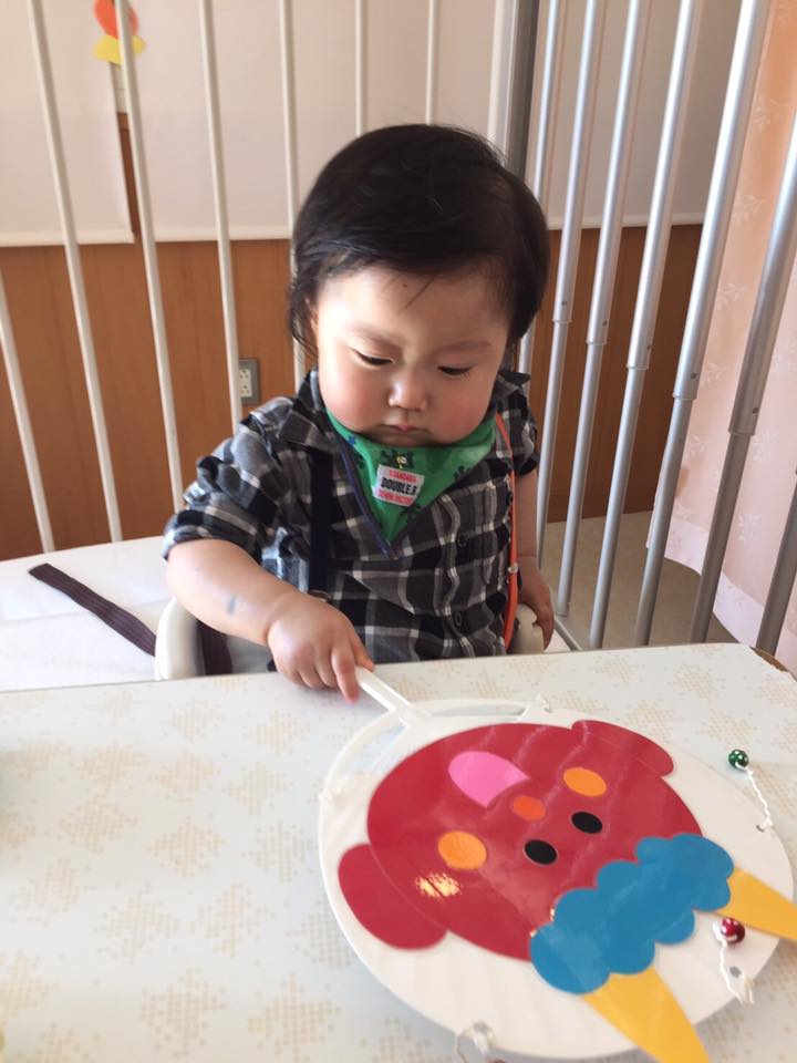 鬼のでんでんうちわを保育士さんが作ってくださいました。