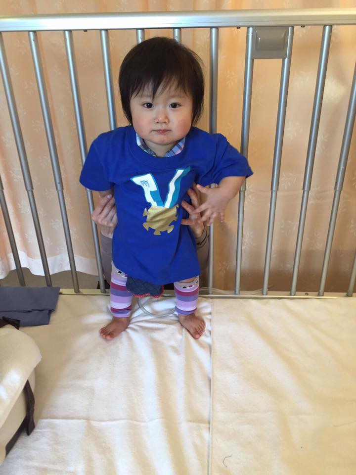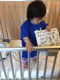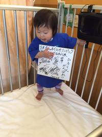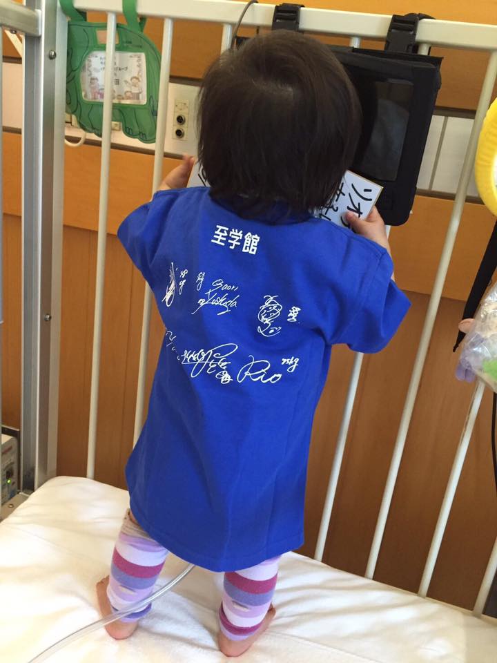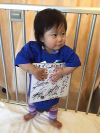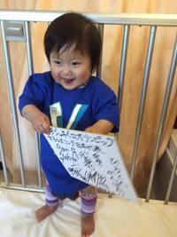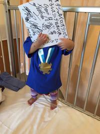 かわいい青色のTシャツと「ひろくんがんばれ」と書かれた色紙。