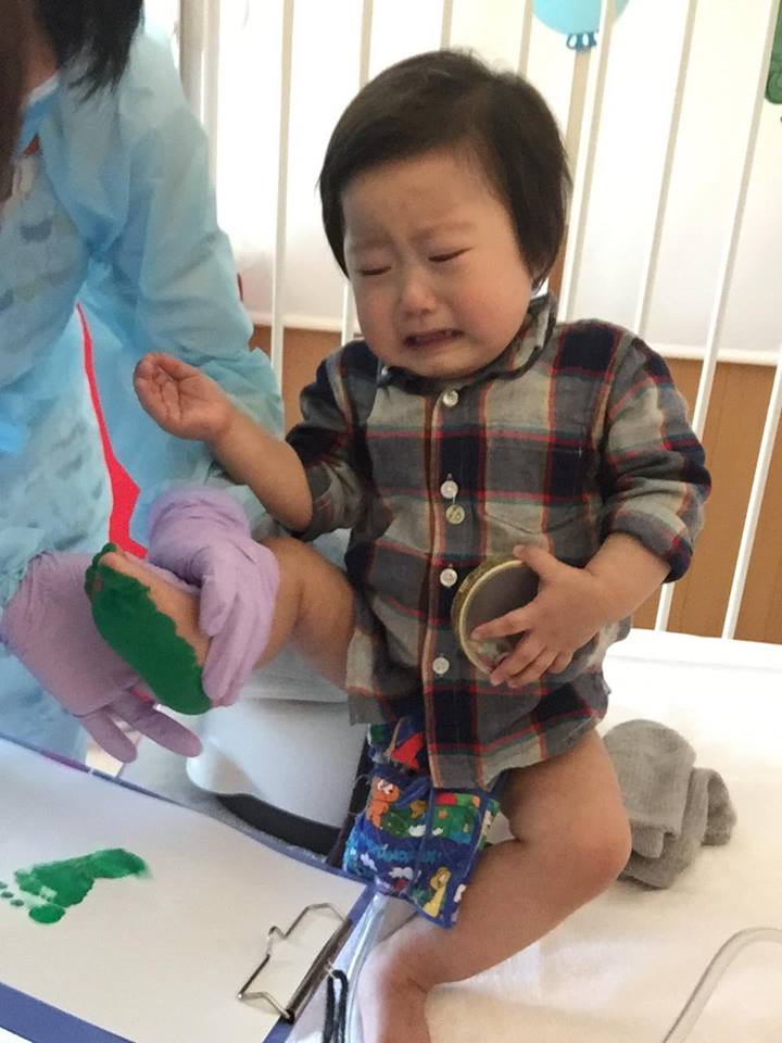 ひろは拘束されるのが大嫌いで、痛くないとわかっていても涙が出てしまいます。なので手型、足型をとるのはちょっと苦手なのです。