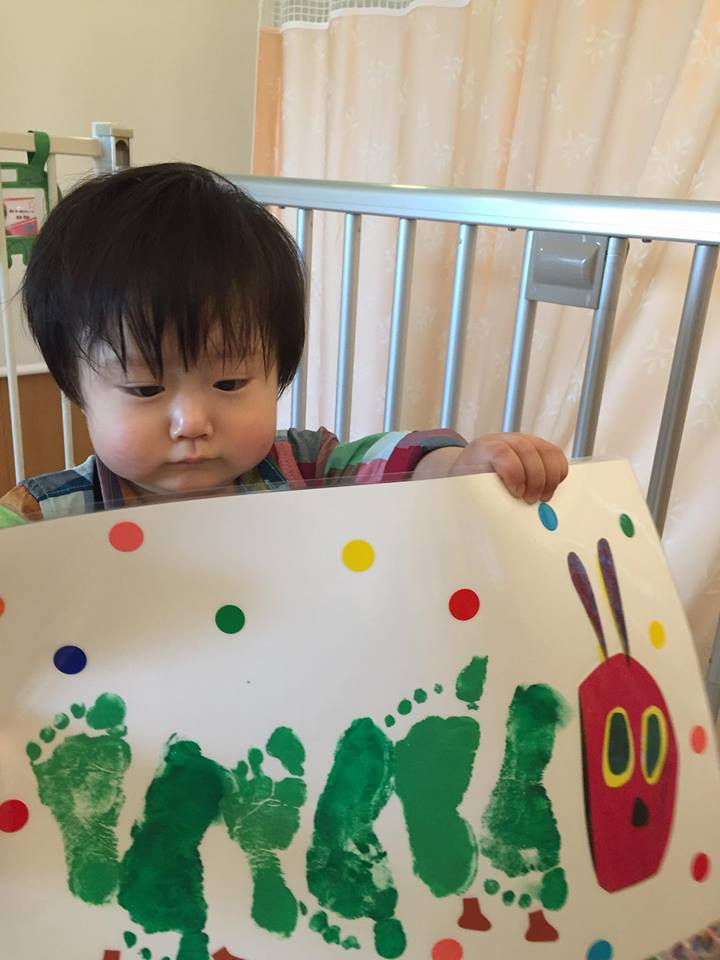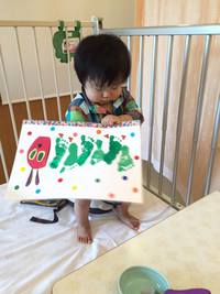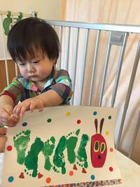 ひろの足型であおむしの胴体を描き、残りは保育士の先生が素敵に仕上げてくださいました![]()